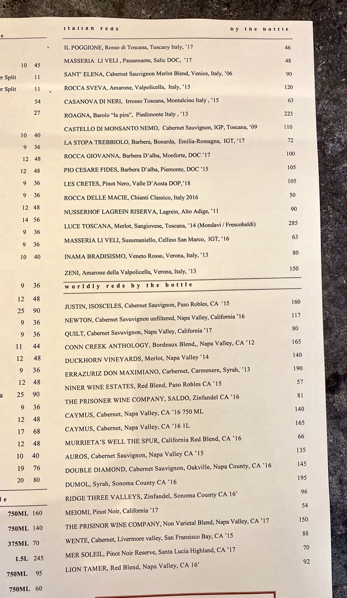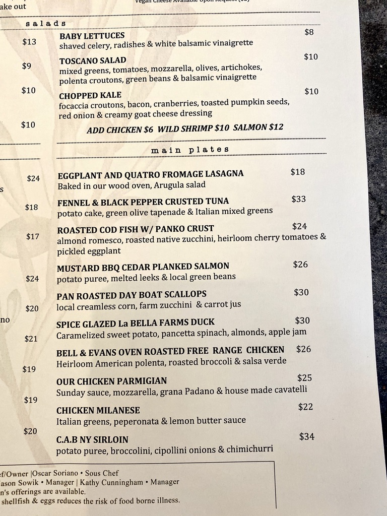 In addition to these categories, the menu features classic Italian-American dishes like Chicken Milanese (featured on Mondays), Veal Parmigiano (Thursdays), Fried Calamari, Penne Alla Vodka, and Wood Oven Baked Rigatoni. Seafood options such as Fennel & Black Pepper Crusted Tuna are also available. Desserts include selections like Tiramisu Creme Brulee and Nutella Pie.