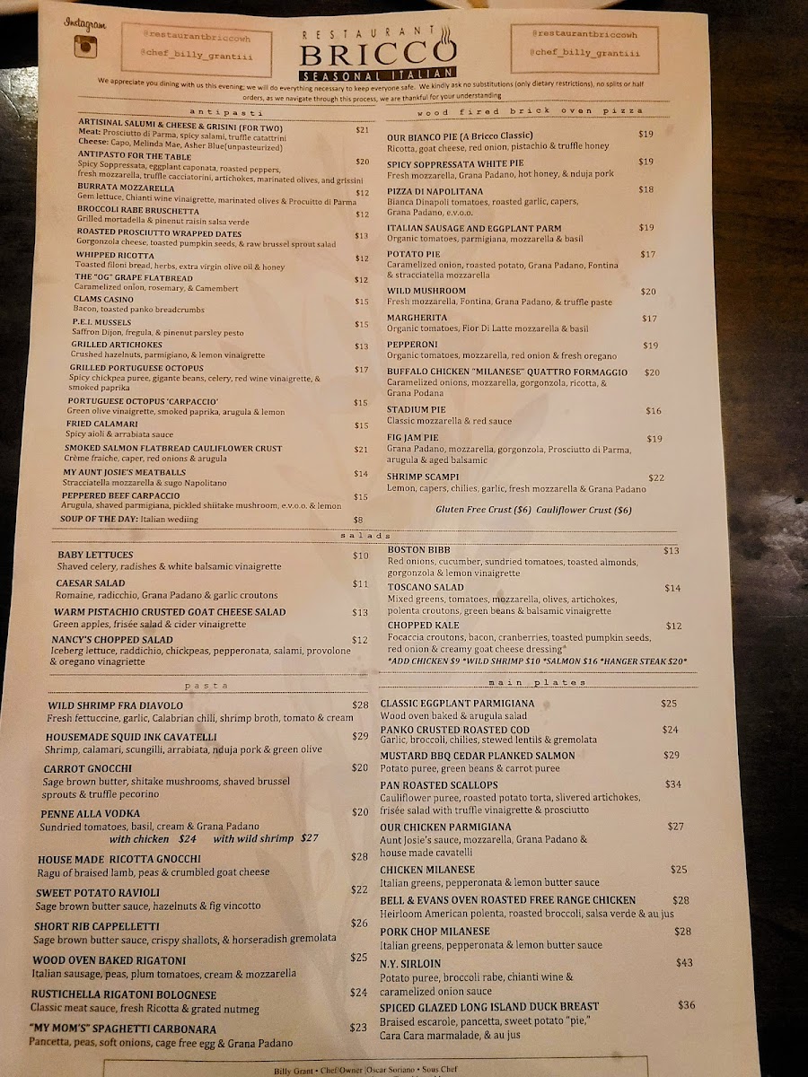 The menu at Restaurant Bricco offers a selection of Italian-inspired dishes suitable for lunch and casual dining. It is structured into several key categories to accommodate a variety of preferences and meal occasions.